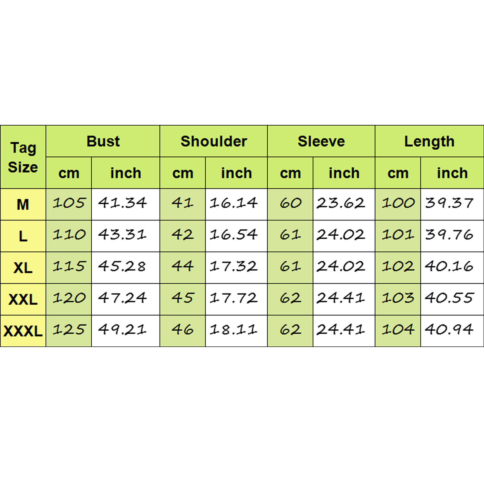 | Size:XXXL | Bust:125cm/49.21” | Shoulder:46cm/18.11” | Sleeve:62cm/24.41” | Length:104cm/40.94” |