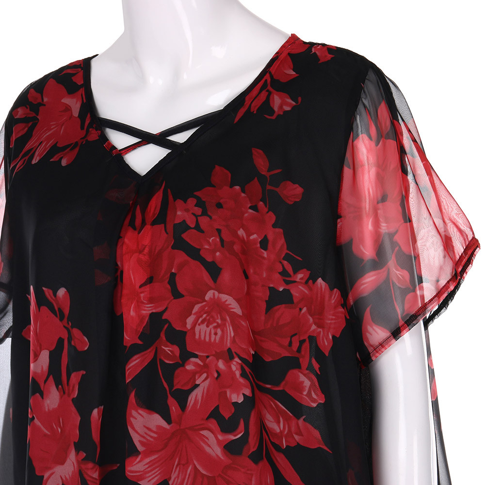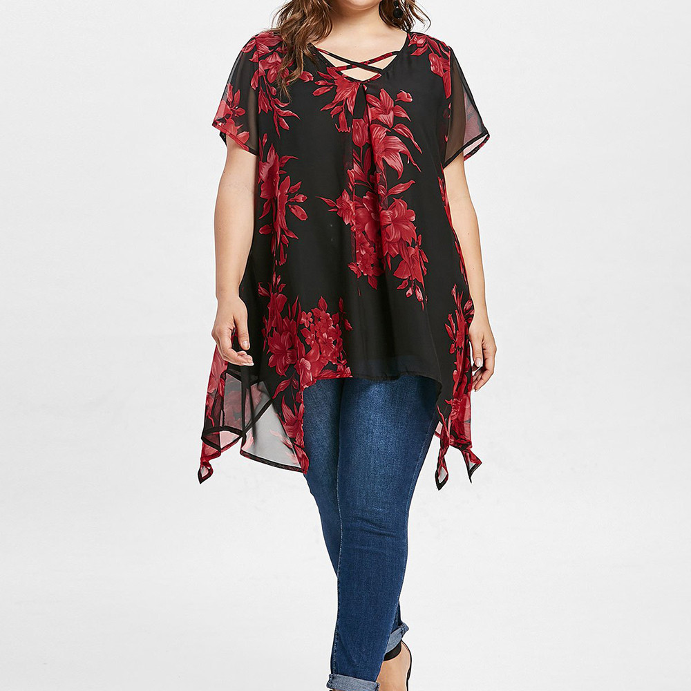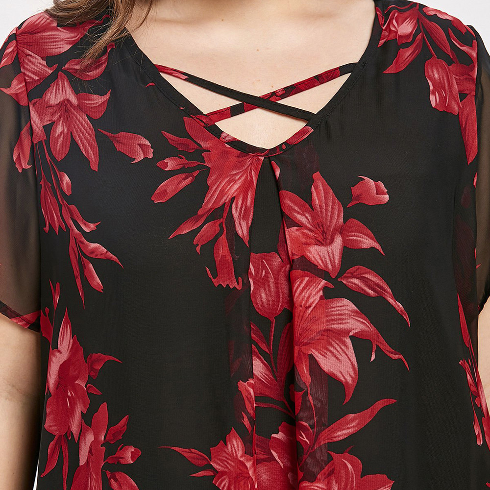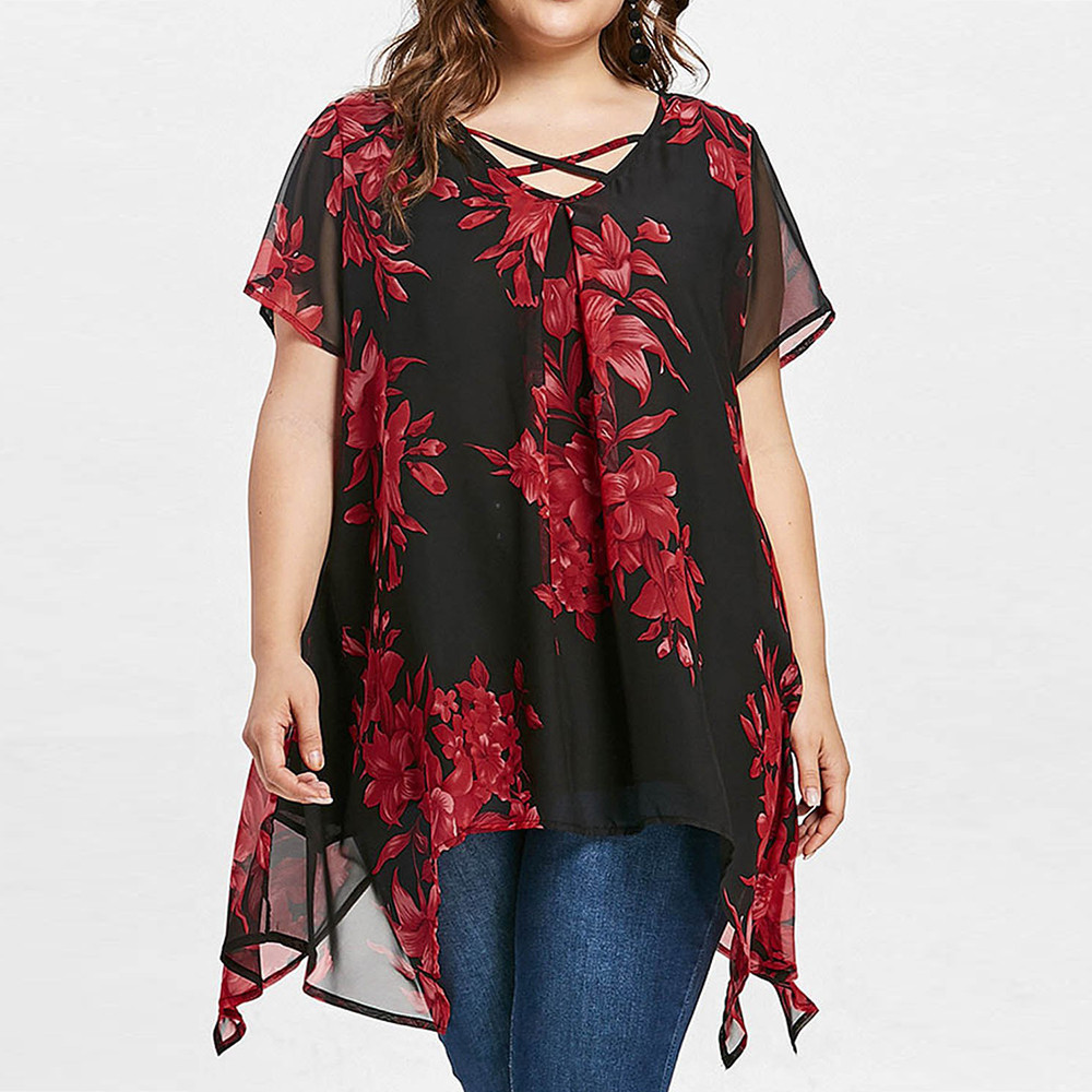 Women Plus Size Criss Cross Double Chiffon Print Short Sleeve Shirt PulloverTops Blouse