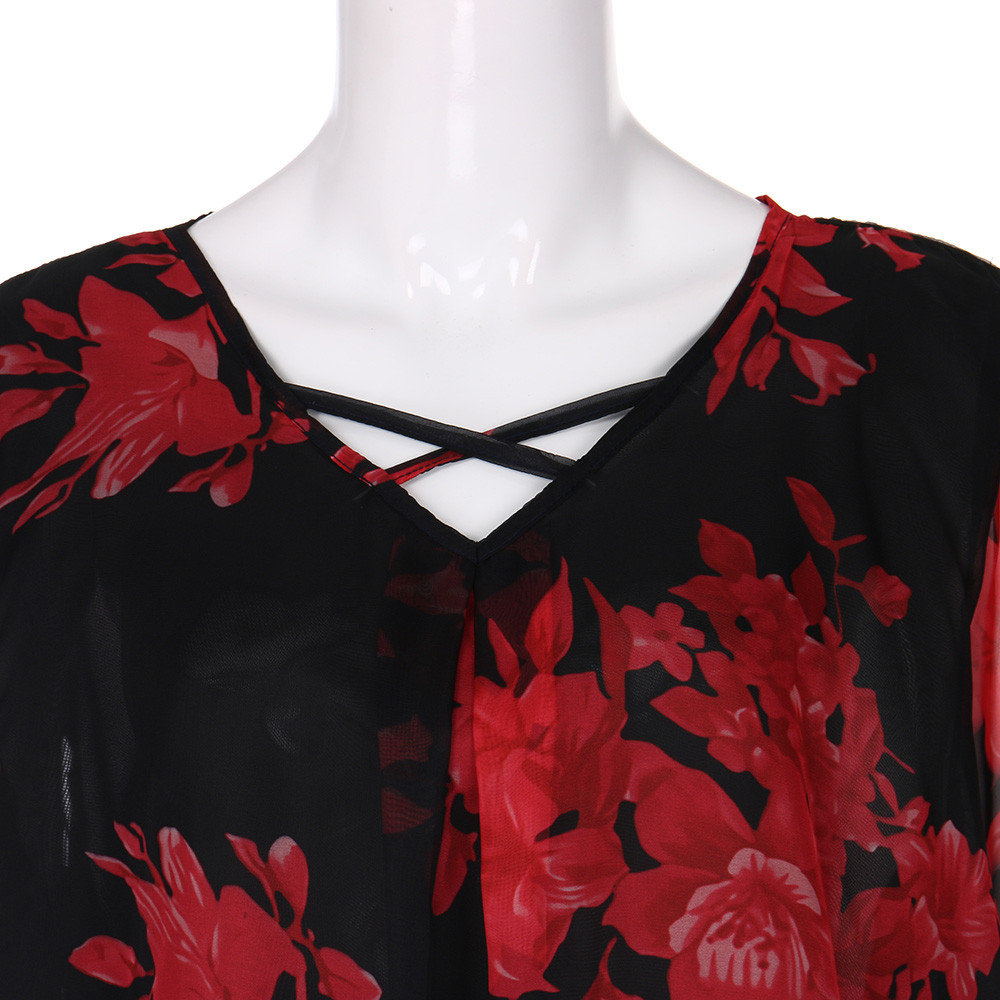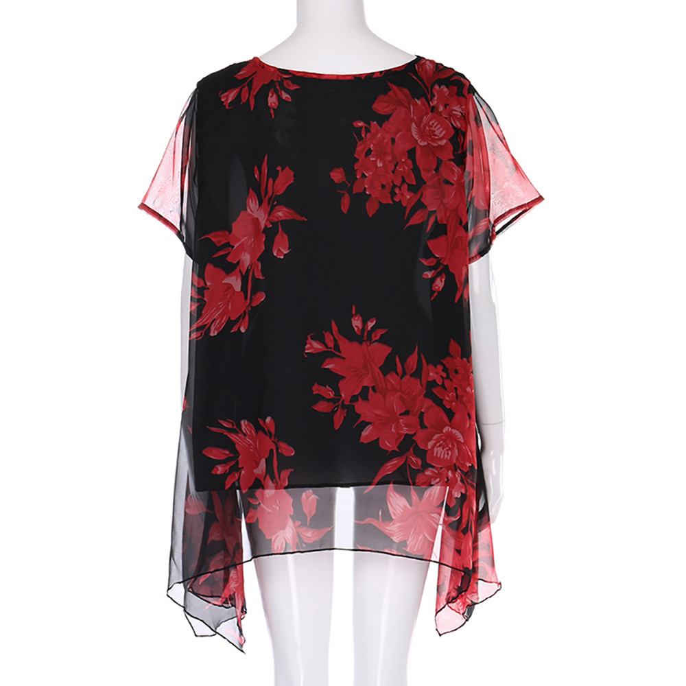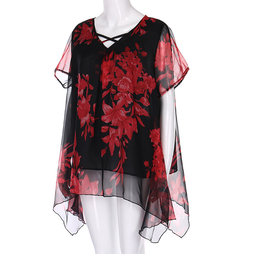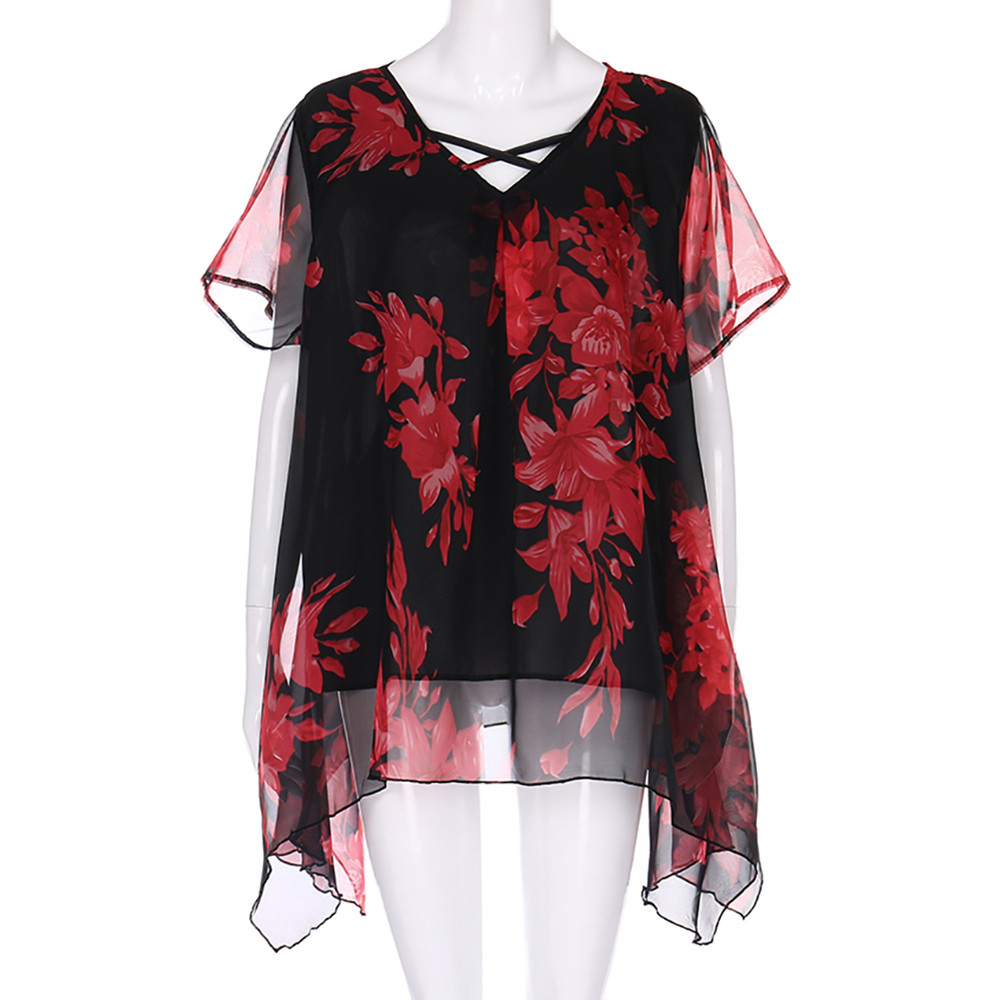 Women Plus Size Criss Cross Double Chiffon Print Short Sleeve Shirt PulloverTops Blouse