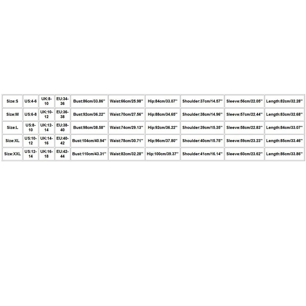 | Size | US | UK | EU | Bust | Waist | Hip | Shoulder | Sleeve | Length |
