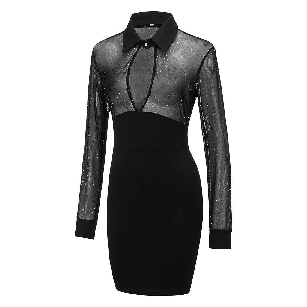 Fashion Women Long Sleeve Glitter Semi Sheer Mesh Patchwork Slim Work Dress